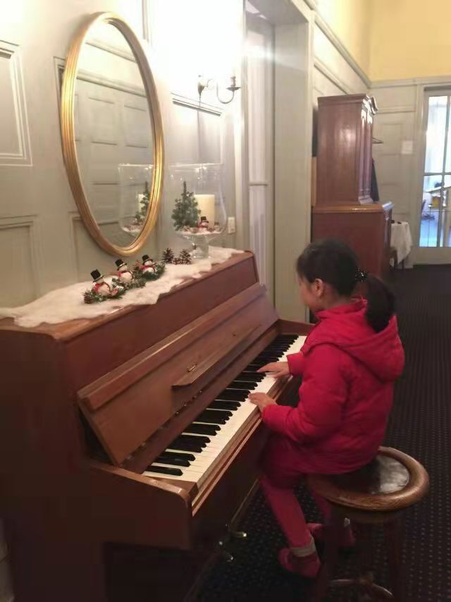 早餐的酒店走廊,有一架钢琴,小姑娘见了,坐下来先弹了一曲《巴赫》。
