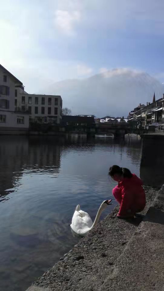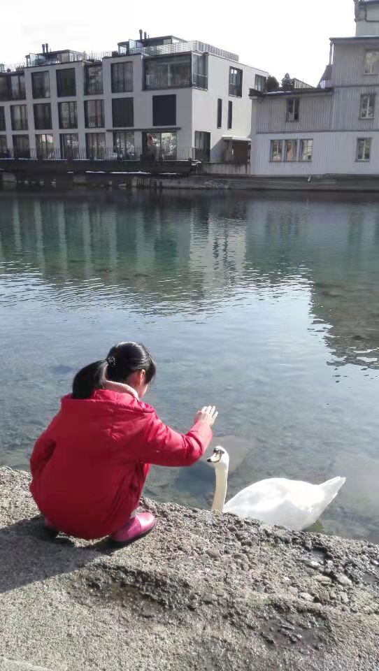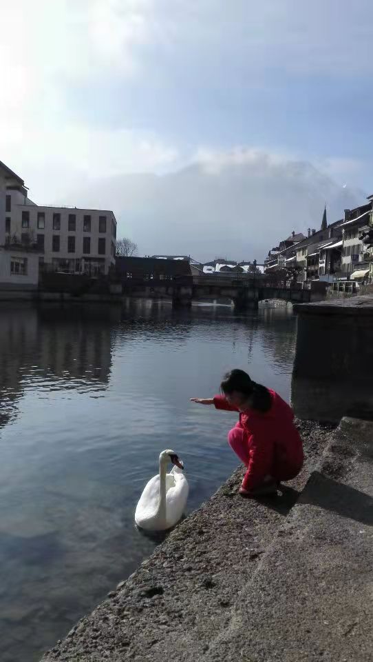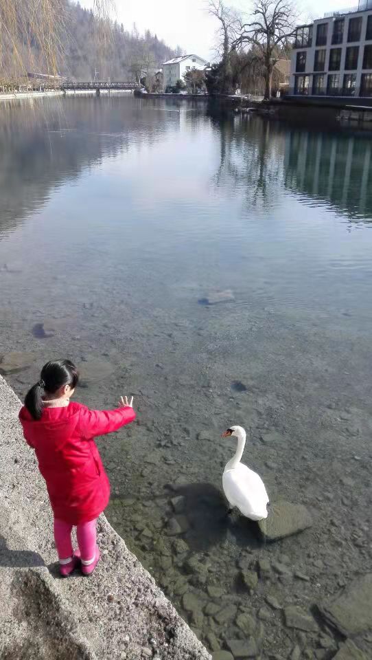 她偶遇白天鹅一只,二者进行了友好的国际交流,长达10分钟。