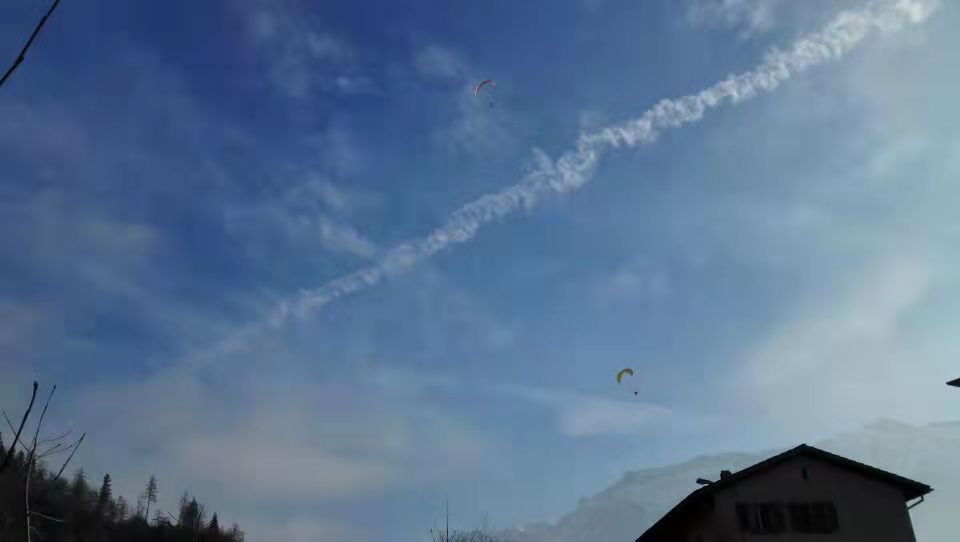 云遮雾绕的世界,滑翔伞在附近的山顶。