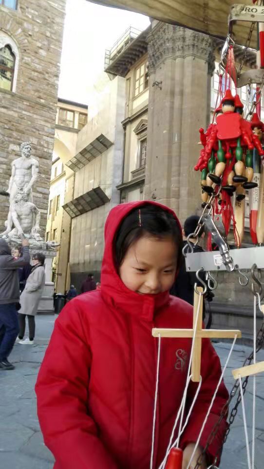 一侧的是身材健美的大卫,一侧是白白胖胖的海神,用嫉妒的眼光看着大卫,这中间原来有一个非常有意思的故事。我们娘俩就是听了这个故事觉得好玩,特意跟海神去合个影。想知道吗?好好查查百度。