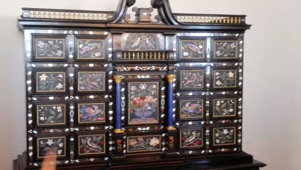 图八,是王后的首饰柜。用贝壳,玳瑁,等珍贵器物,通过工匠手工打磨拼堑而成,这在当时甚至现在都是很难实现的手工艺术。这些零碎小物严丝合缝,色泽原料规整,注意,不是用胶水粘的,太牛了!