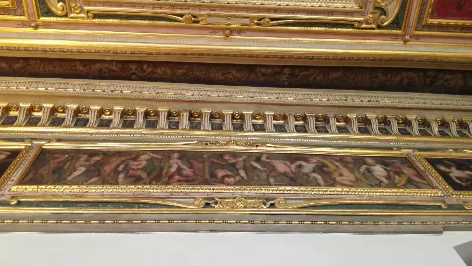图2的房间是王后的休闲室,四壁的壁画都是小天使,但每个天使都有一处劉金线,组在一起是王后的名字拼音的字母,国王够浪漫吧?做王后多么幸福啊!