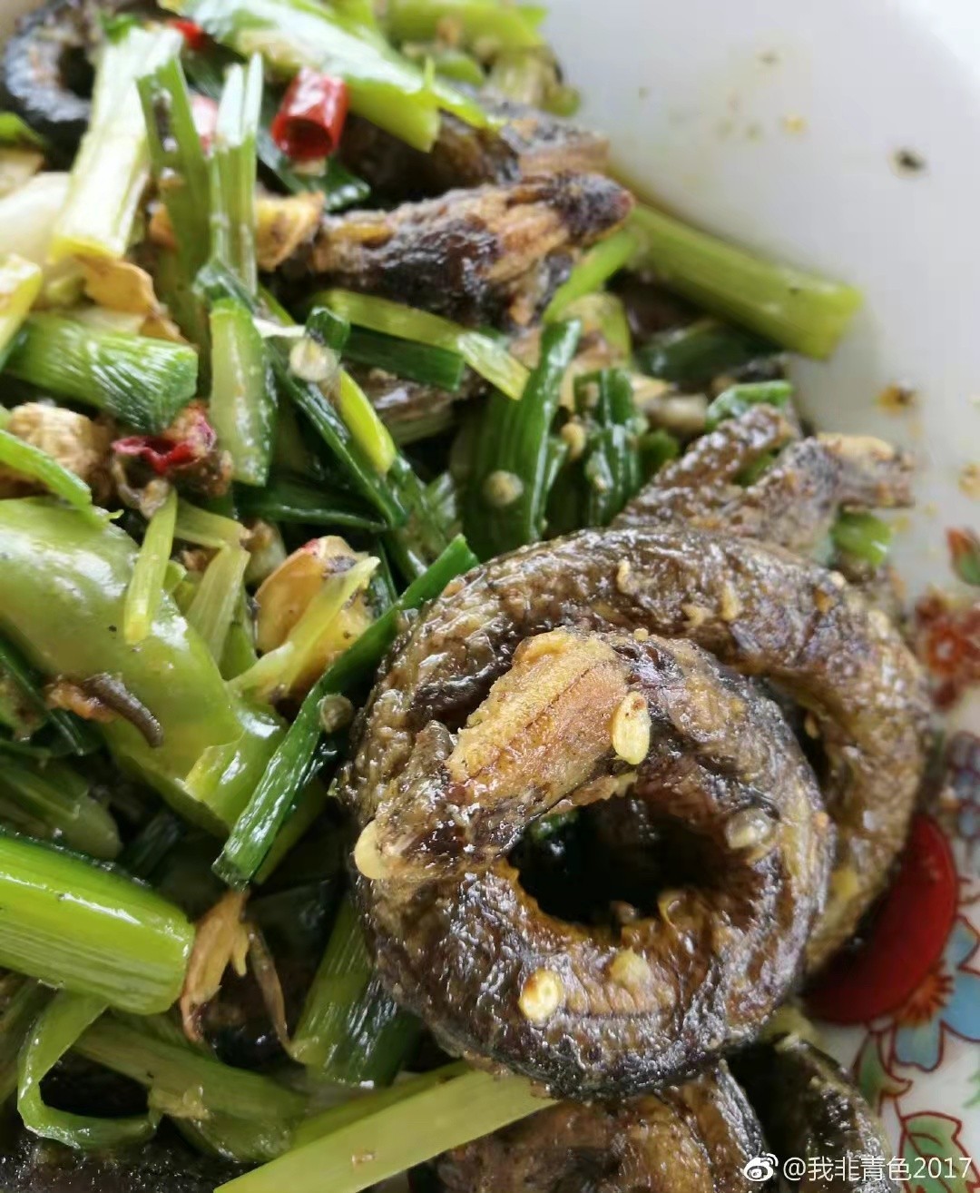 下图是烧野生黄鳝,儿时可与泥鳅捉于田间地头,现在一般市场却极难有,46一斤。辣椒蒜苗一同烧的做法简单,真是美味。