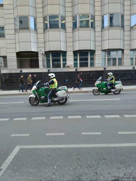 警车 静静地跟随,估计天天面对民众游行都麻木了。