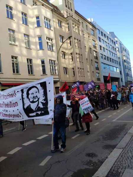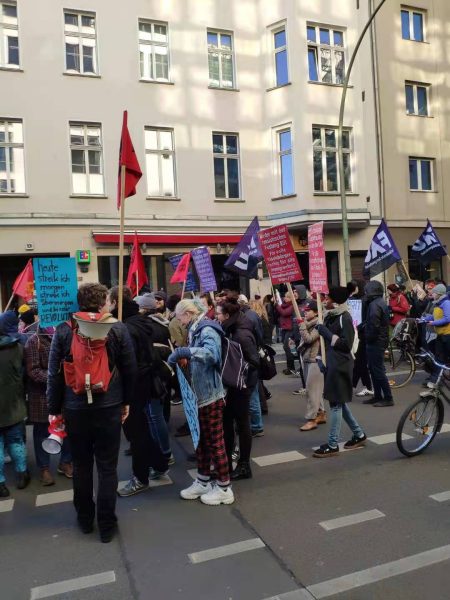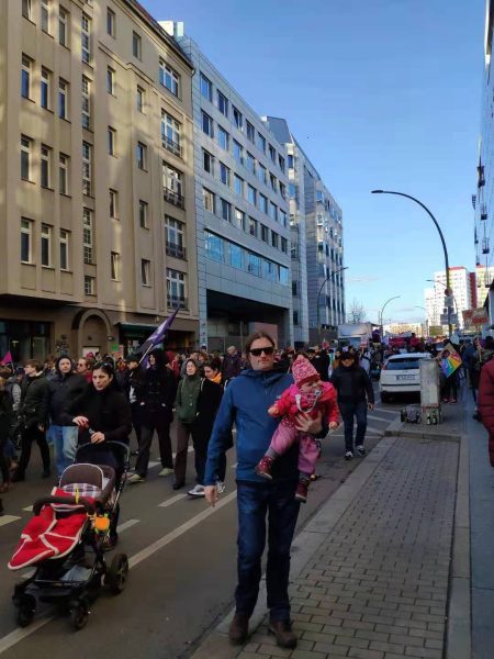 当晚的电视台还对这次妇女节游行进行了特别报道。不止柏林,其他城市也举行了大游行。街道上跟过节似的,从来没挤过这么多人。这种兴高采烈的热闹,就跟咱们过年赶集似的。后面跟着的警车 并不驱赶人群,而是保护,还有救护车’n辆,因为人群中有很多妇女儿童,是为了随时救护。