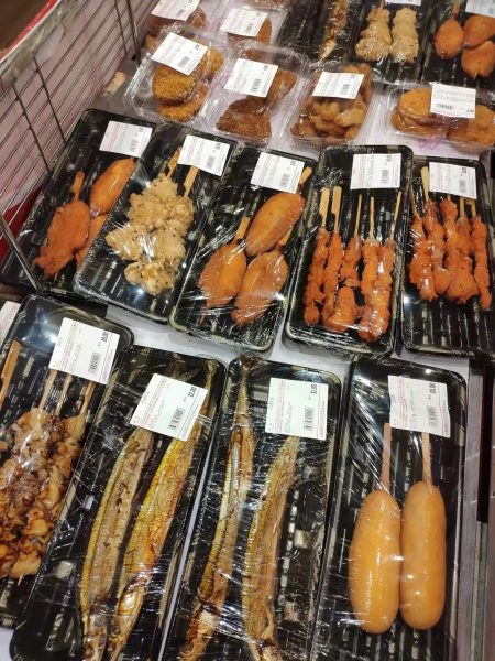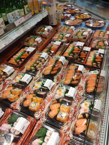 因为临近日韩,这个日式风格大超市里,寿司摆成了十几米的“海洋”,视觉壮观,且服务意识强,摆放得色彩斑斓、干净整齐、诱人食欲。