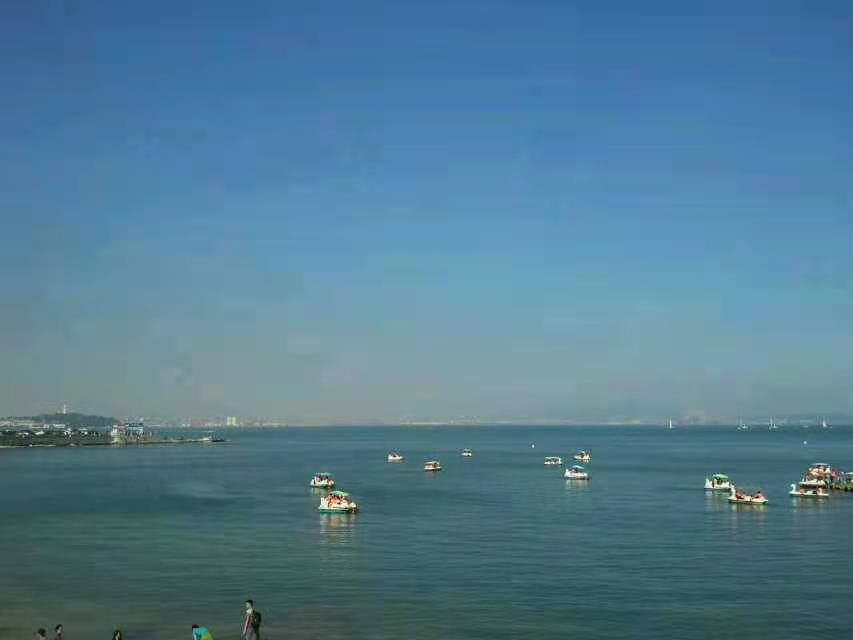 人少,船少,天高海阔。让我们想起了玉渊潭划船,只是没有这么大的浪。太羡慕烟台的小朋友了。划着船,随时可以上边上礁石,抓个小螃蟹啥的。
